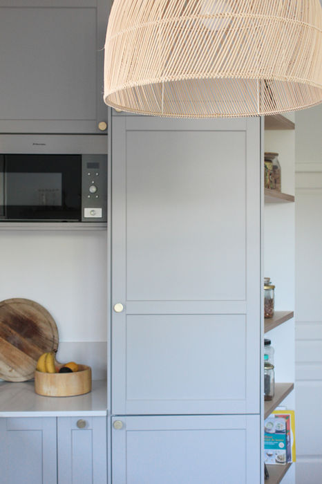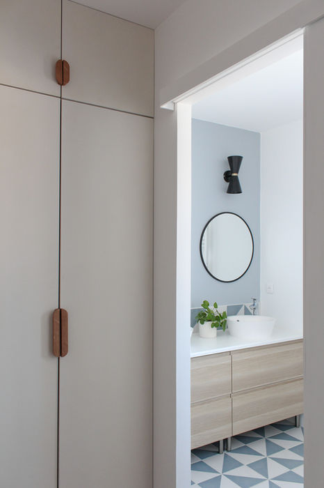 Aussi, nous avons d'abord repensé le plan pour mieux optimiser les espaces au rez-de-chaussée et créer une deuxième salle d'eau à l'étage. Puis, nous avons réaménagé les pièces pour qu'elles accompagnent au mieux la famille dans son quotidien : rangements sur mesure, grande bibliothèque, nouvelle cuisine. Le bois clair choisi contraste avec le sol du rez-de-chaussée, tandis que les touches de couleurs viennent rompre avec l'uniformité initiale et souligner les aménagements créés.