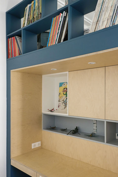 Cette belle et grande pièce aux allures haussmaniennes n’avait qu’une seule fonction avant notre intervention, celle de chambre pour son jeune occupant. Surdimension-née, il était nécessaire d’optimiser la surface qu’elle offrait et de l'adapter aux besoins de ce dernier.